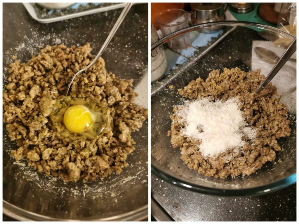Once ready, remove from the heat, place the mixture in a bowl, add the grated Grana Padano, breadcrumbs, egg, pepper, nutmeg, and adjust with salt.