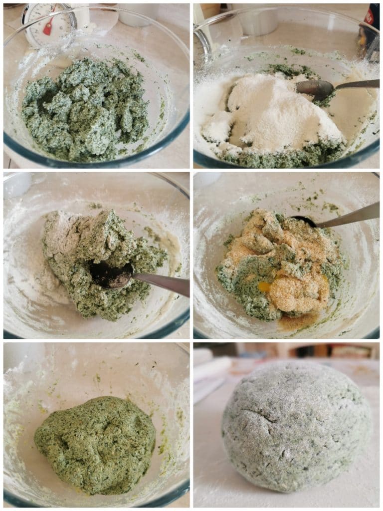 Meanwhile, in a large bowl, we place the ricotta and spinach, mix them. Add the cheese and breadcrumbs, mix, add the egg, salt, and nutmeg. Work everything until a homogeneous dough is obtained. If the dough is too soft, add more flour, but not too much; it should still be soft