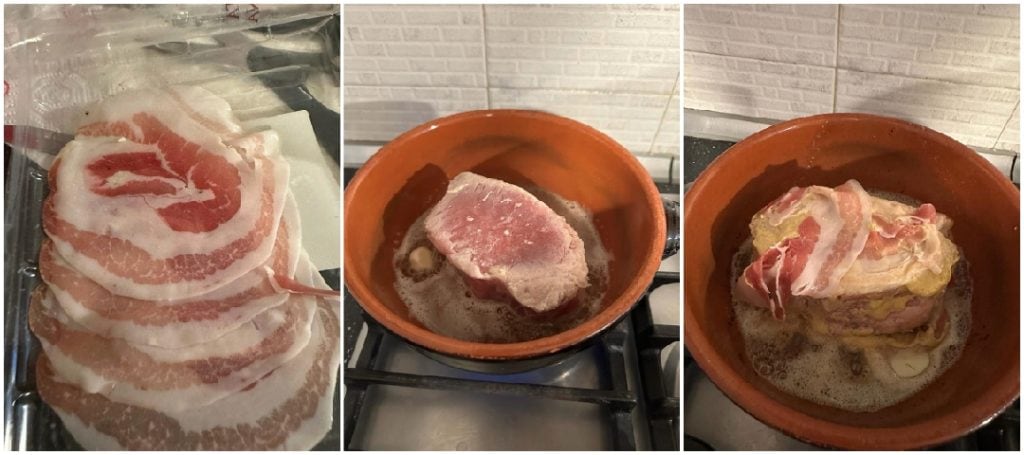 Start by putting the oil, butter, and a sprig of rosemary in a casserole, add the tongue and brown it over high heat on all sides. Deglaze with a little white wine and once evaporated, salt, pepper, add the slices of bacon, and a little vegetable broth. Cook for about 30/40 minutes, gradually adding more hot broth to prevent the meat from drying out too much.