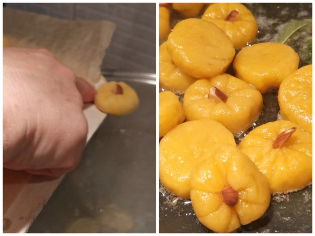 Making pumpkin gnocchi at home is simple, the important thing is to follow certain rules. To avoid gnocchi that are too hard, due to too much flour, or too soft, from using a too watery pumpkin. The pumpkin should be baked in the oven, so that the pulp is drier, and the right amount of flour, so it doesn’t cover the flavors. I thought of giving this very cute and fun shape, simple to prepare you’ll see, you can use it for some special occasion, like Halloween, or special parties