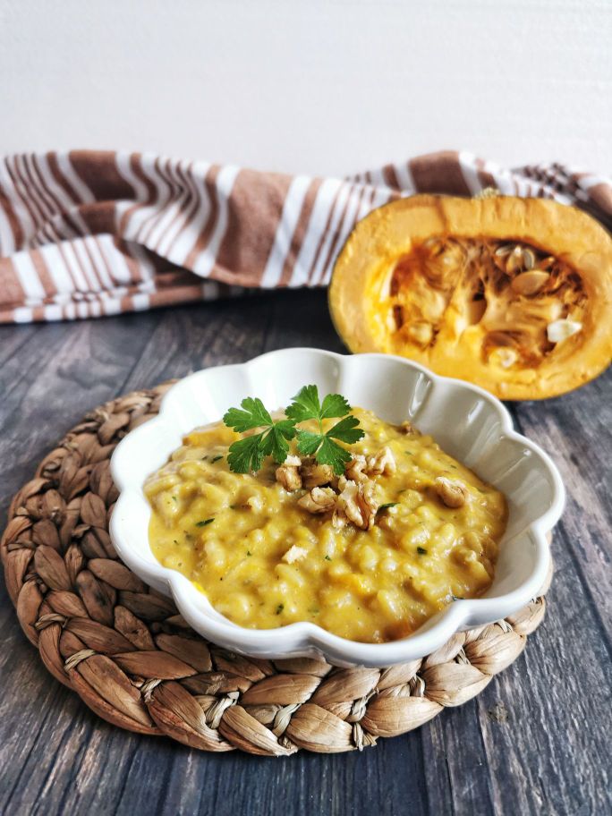 RISOTTO WITH PUMPKIN, GORGONZOLA, AND WALNUTS. The risotto with pumpkin, gorgonzola, and walnuts is a creamy and tasty first course, perfect for the autumn season.