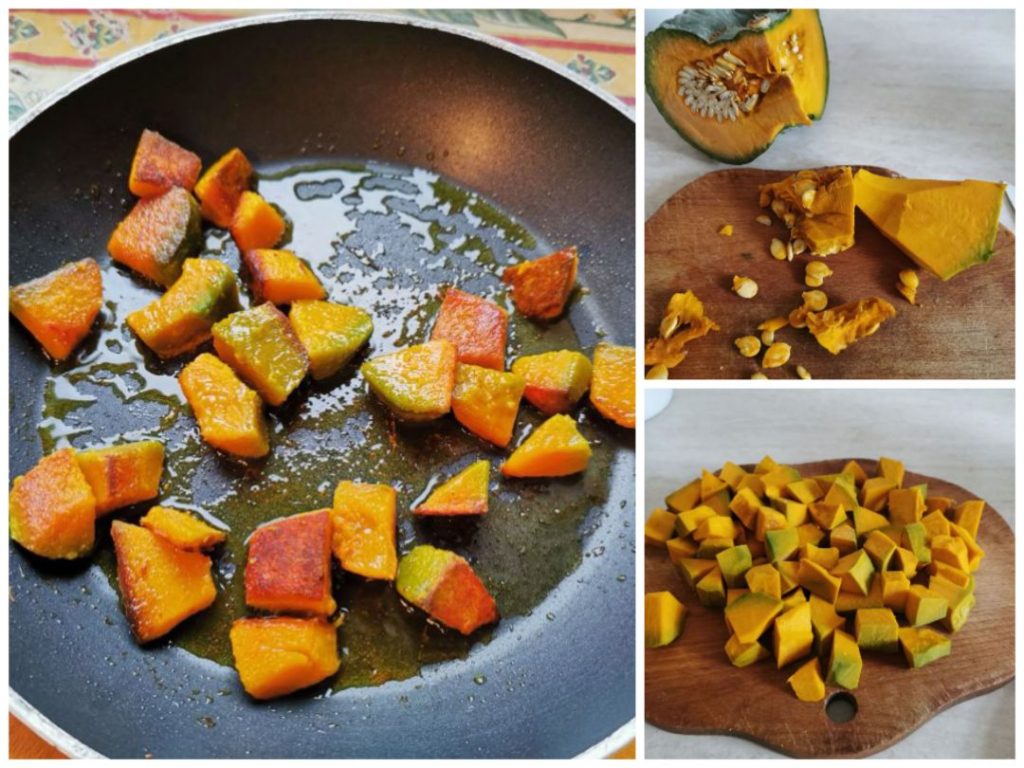 • Let’s deal with the pumpkin, cut it in half, then into slices. Remove the skin and cut the slices into chunks, which we’ll cook in a pan with a little oil, a piece of butter and let it cook on medium heat for about 20 minutes. Turn off the heat and cover with a lid.