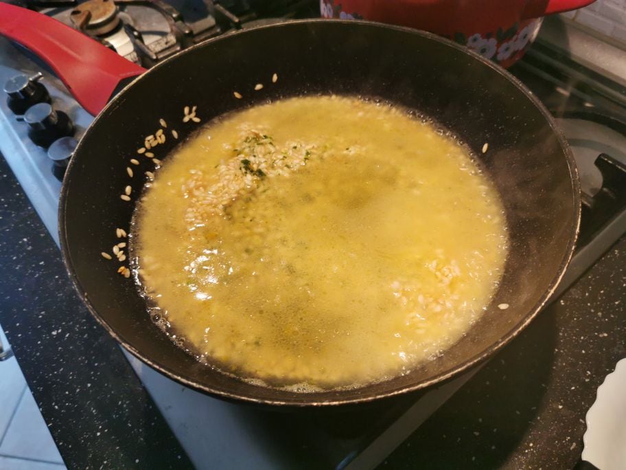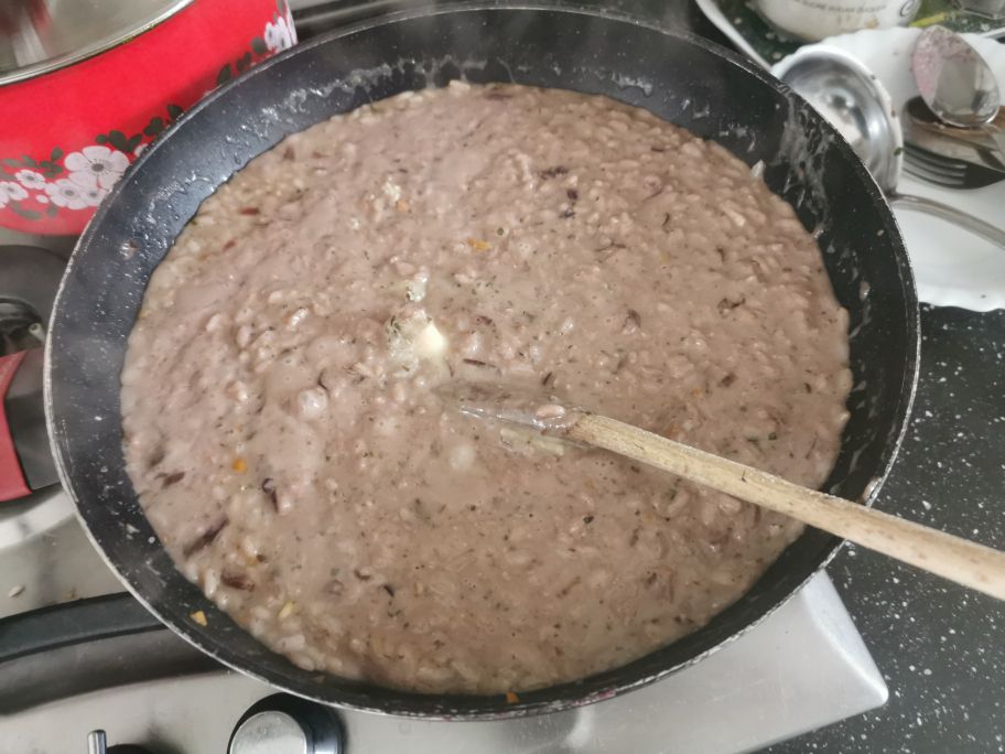 Finish the risotto, about 3 minutes before the rice is done, add the radicchio pesto. Bring the risotto to the end of cooking, turn off the heat.