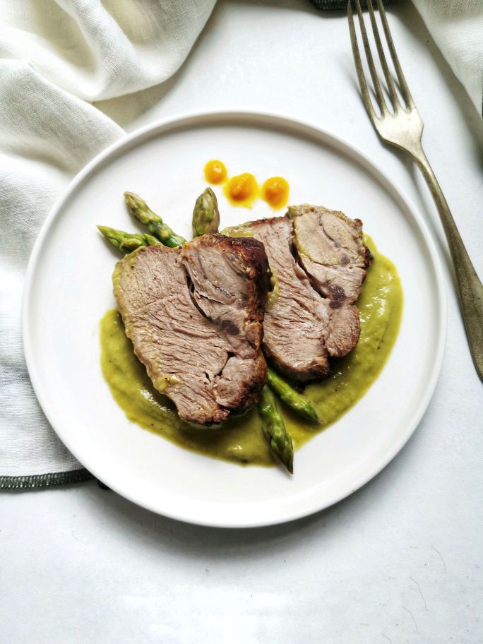 Roast pork neck with asparagus cream: a refined and tasty main course
