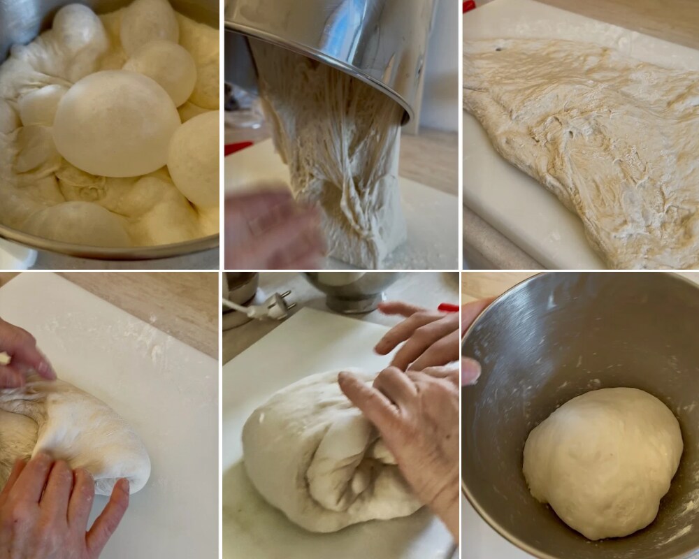 • Take the risen loaf, transfer it to a floured work surface, slightly stretch it into a rectangle with your hands, and fold it like a wallet. Then place it to rise in a well-floured bowl, with the folds facing downwards, cover with a floured cloth and let it rise for 2/4 hours at room temperature