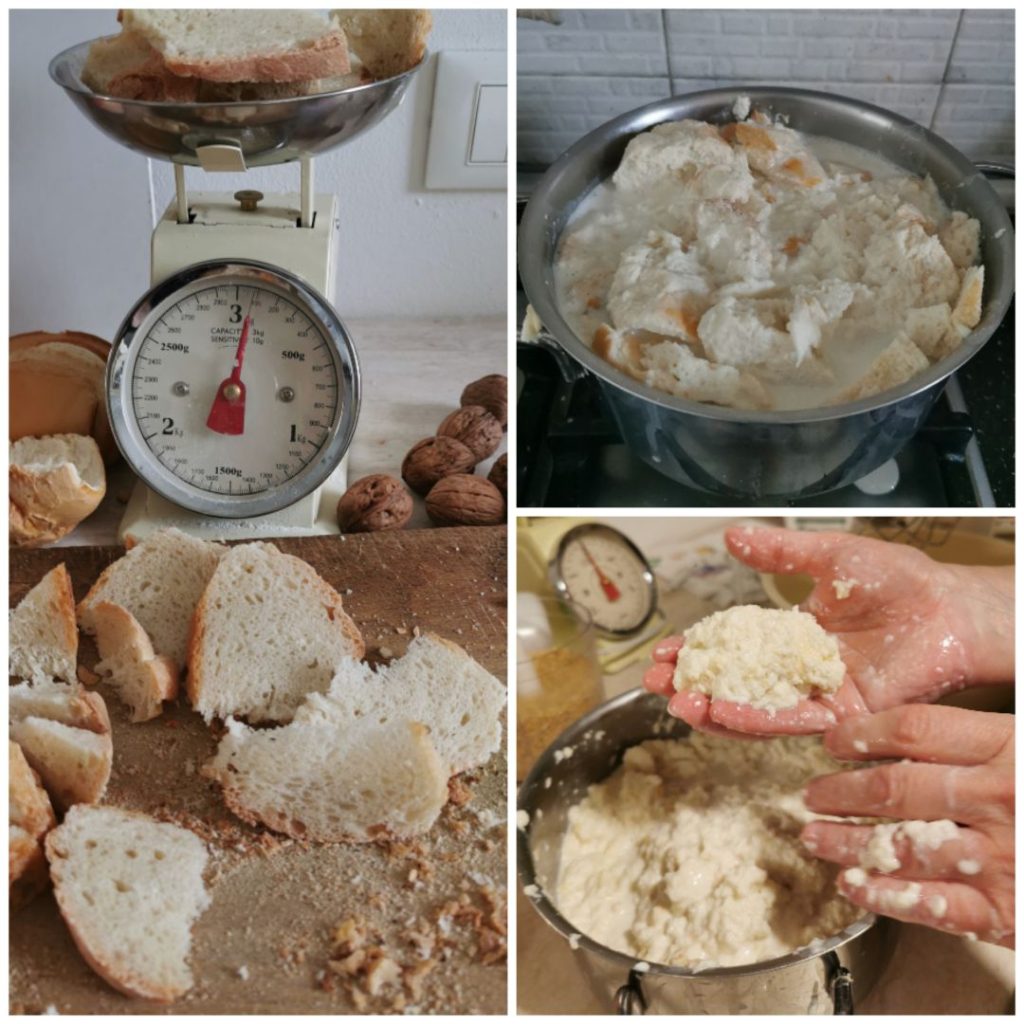 Start by slicing the bread, remove the harder crust, and soak it in warm milk for about 2 hours. Then drain the bread from the milk, squeeze it lightly and put it in a rather large bowl, set aside.