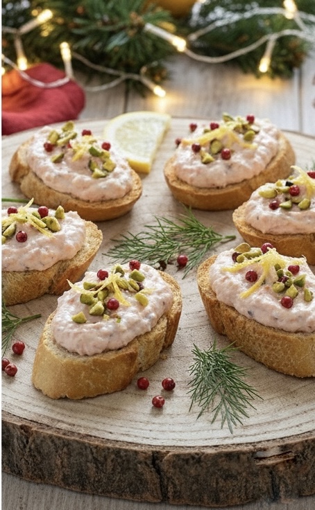 Assembly and Decoration: Generously spread the mousse on the toasted crostini. Decorate each crostini with ground pistachios and a few pink peppercorns. If desired, add a small sprig of fresh dill for a touch of color and aroma.