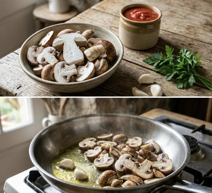 At first they will release their liquid: let it evaporate almost completely so the mushrooms begin to brown, capturing the flavor of the oil and garlic.