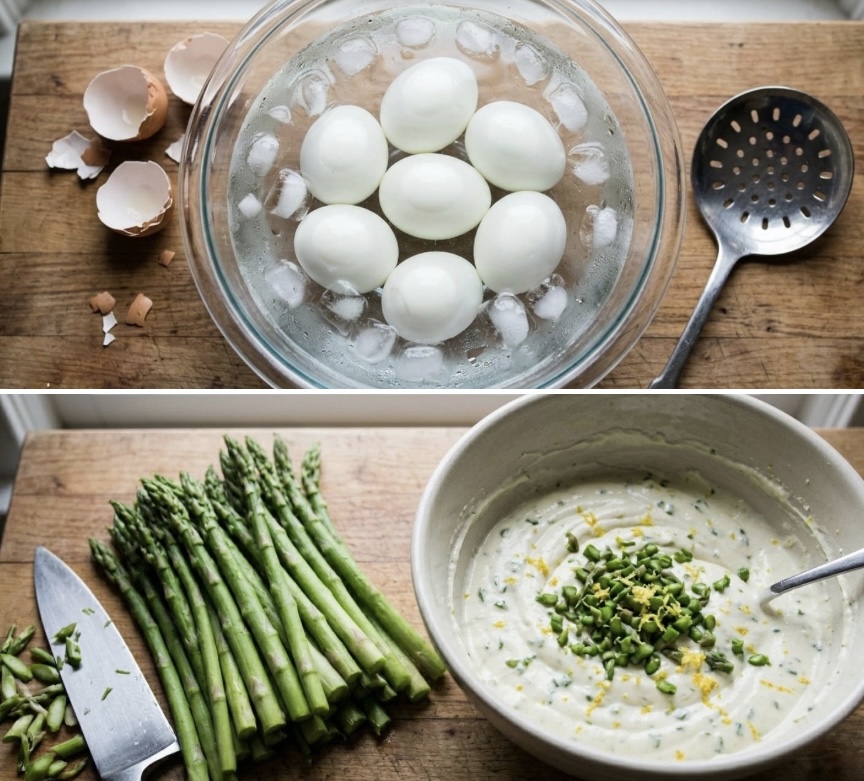Steps for stuffed eggs with ricotta and asparagus mousse