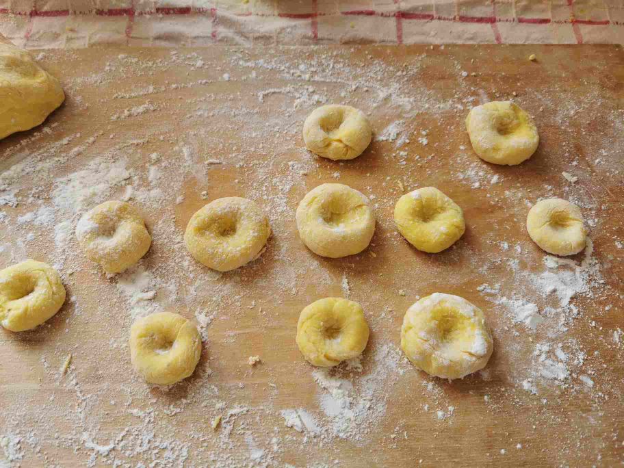 Once cool, add the flour, egg, and saffron, add the salt and work until you get a homogeneous and elastic dough. Shape many round gnocchi, about the size of a walnut, make a small indentation in the center to insert the filling and set aside