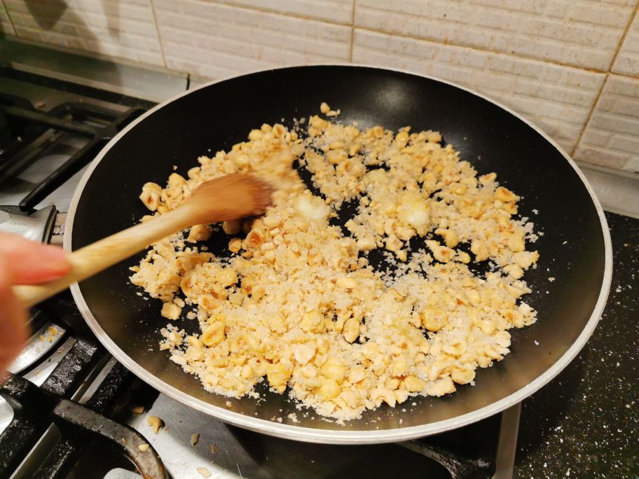 In a skillet put the butter, sugar, and hazelnuts. Place everything over high heat and stir continuously with a wooden spoon until the sugar is caramelized.