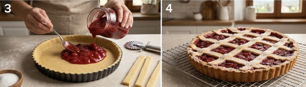 Remember: the butter must stay cold and the dough needs to rest in the fridge to allow the gluten to relax, guaranteeing that “cookie-like” texture everyone loves. A properly made tart should have high, crunchy edges that enclose a ruby-red filling, already inviting at first glance.