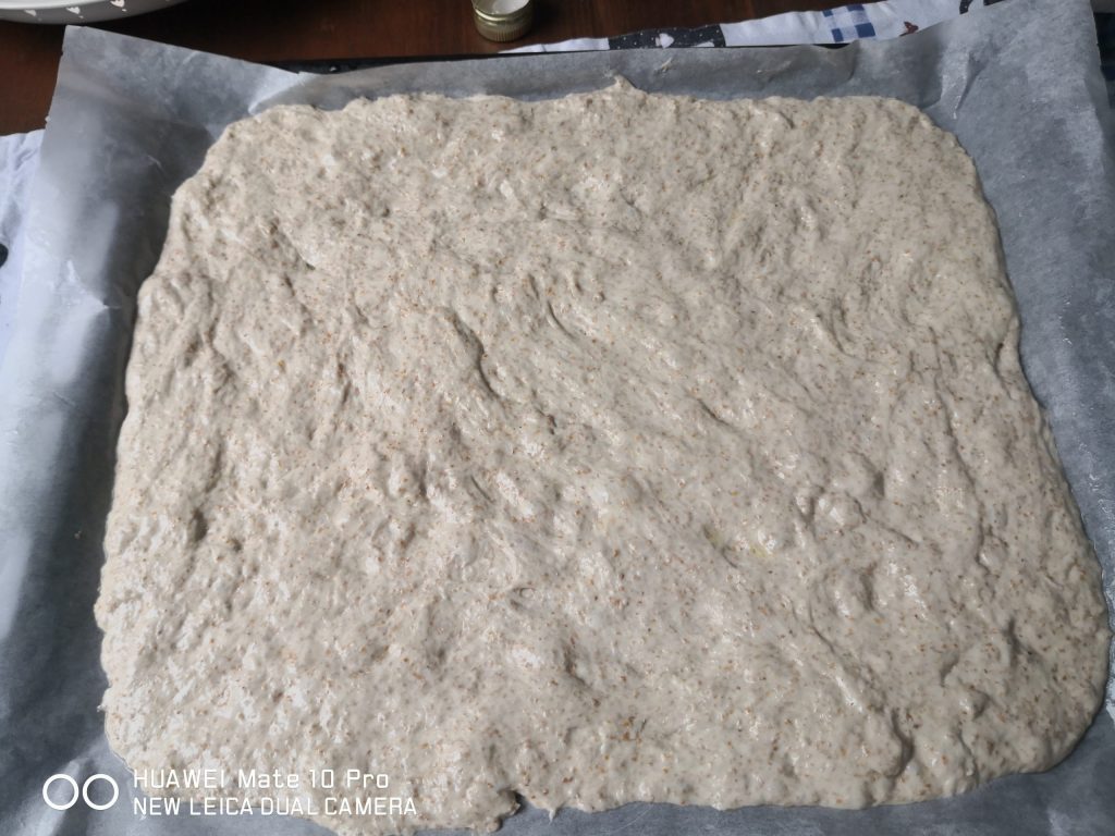 • At the time of spreading, line a rectangular baking pan of about 16×14 inches with parchment paper and oil. Turn the bowl with the dough onto the pan, letting it detach by itself. Oil the surface of the dough and your hands, spread the dough covering the entire pan, stretching it without pressing it. Let it rest for about 30 minutes.