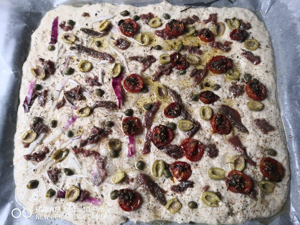 Then start filling the focaccia, I spread capers, olives, anchovies over the entire surface, then finished one half by adding finely sliced Tropea onion, and the other half with confit cherry tomatoes, salt, pepper, and extra virgin olive oil. Finally, spray a little water on the surface.