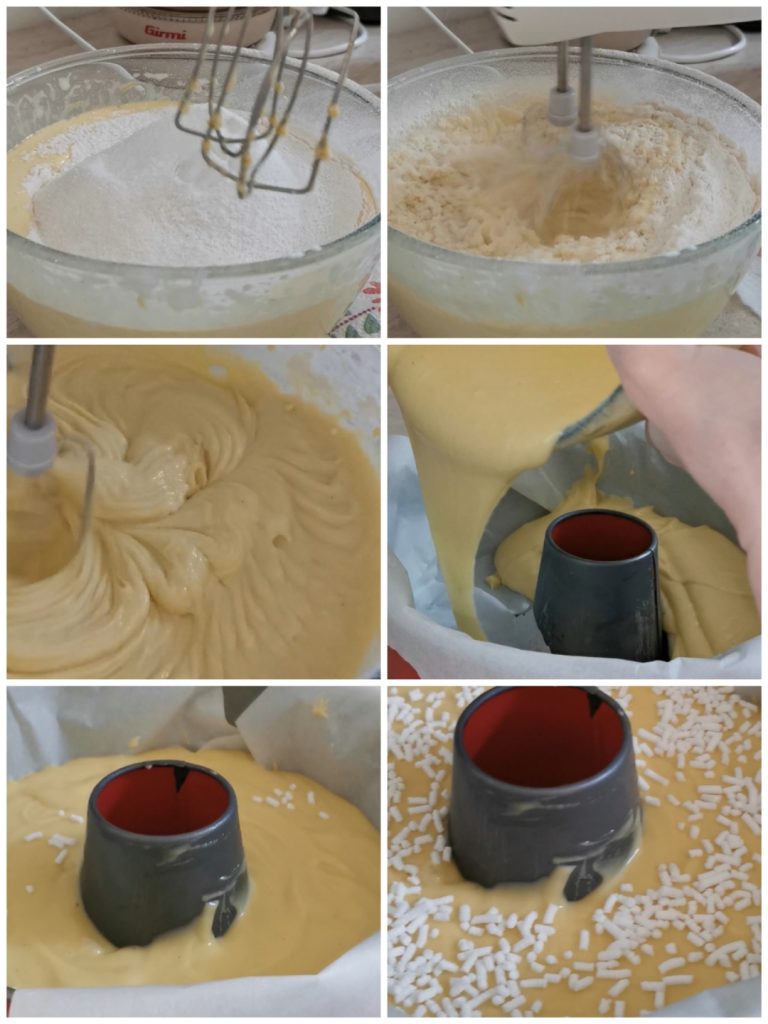 Sift the flour, baking powder, and salt, and add them all at once to the mixture; mix at low speed so that the batter gains consistency. To have a perfect bundt cake, the batter should not be too liquid, nor too thick. Pour it into a 9.5-inch diameter bundt cake pan, greased and floured, or lined with parchment paper. Decorate the surface with sugar sprinkles