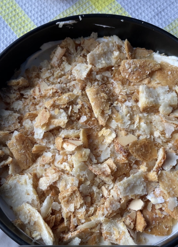 Add the second portion of sfogliatine, press lightly and cover with the remaining cream. Finish by covering the surface and sides with the last portion of sfogliatine, creating the crumbly effect typical of this dessert.