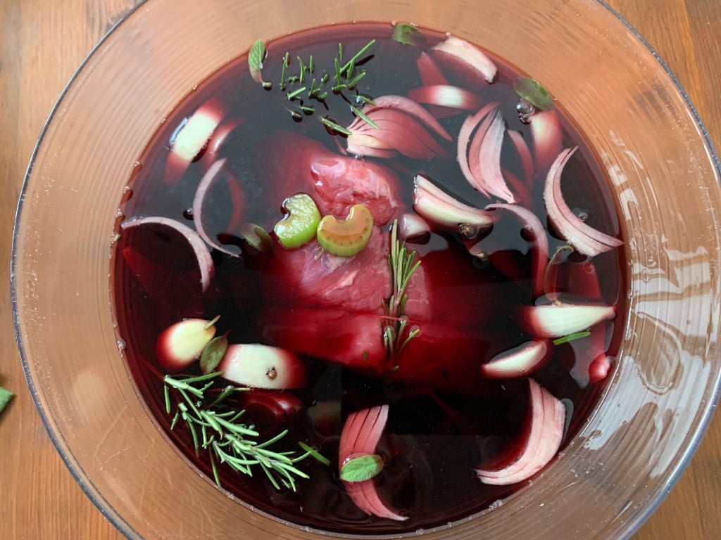 The next day, dry the meat well, remove the vegetables from the bowl, and set aside the marinade wine.