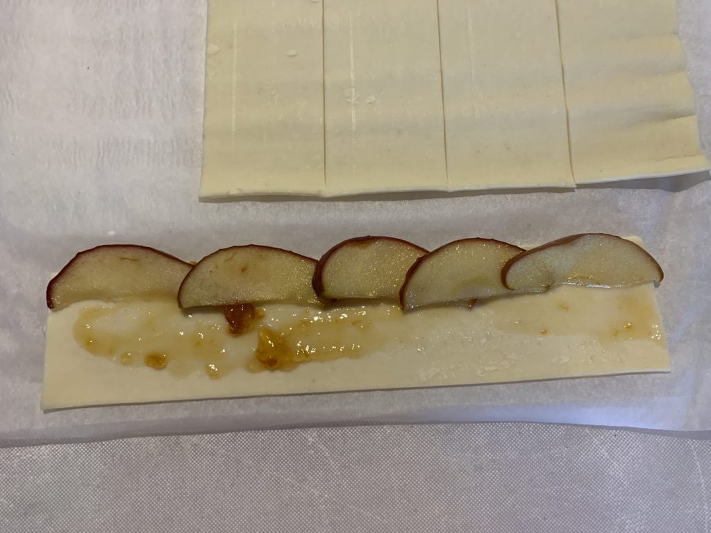 Spread a teaspoon of apricot jam on a strip and place the apple slices close to each other on the top, with the peel side up (5 slices).