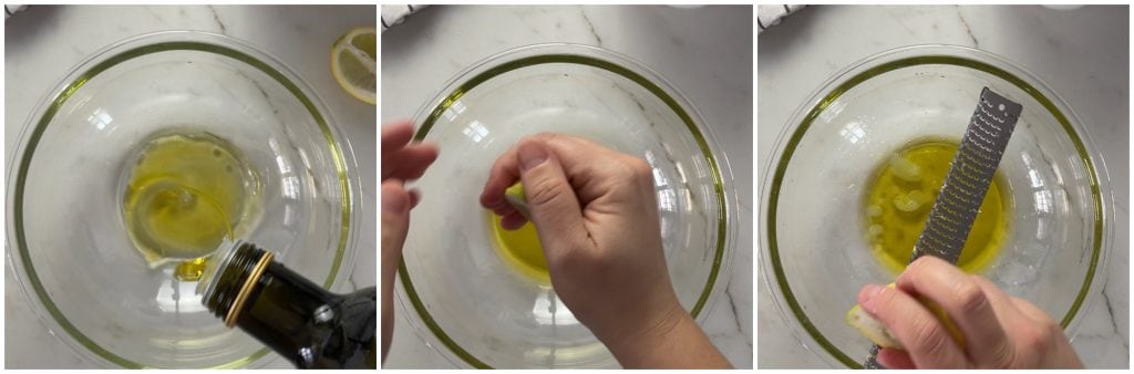 Pour the extra virgin olive oil into a bowl along with the lemon juice and grated zest.