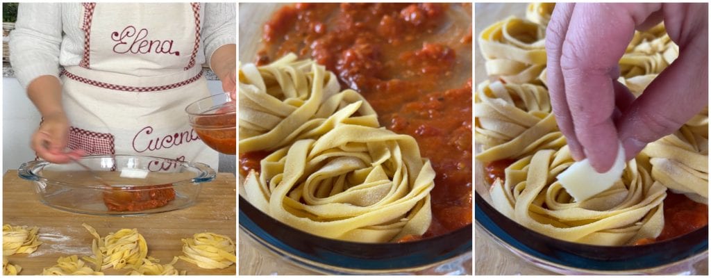 Place cubes of mozzarella in the center of each tagliatelle nest, this will make your baked pasta even more delicious.