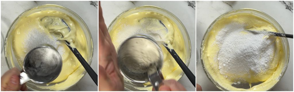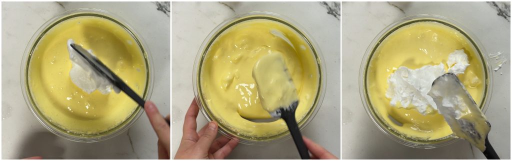 • Combine all the whipped whites with the yolks and continue to mix to blend the mixture, being careful not to deflate it.