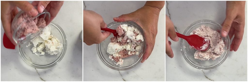 Transfer the cooked ham filling for ravioli into a piping bag and fill your favorite fresh pasta!