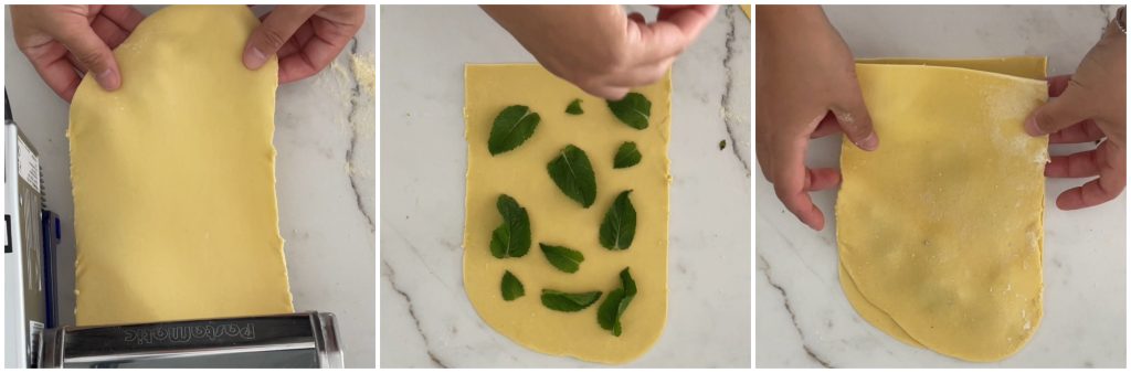 Pass the sheet with mint leaves through the pasta machine again until you get a quite thin thickness.