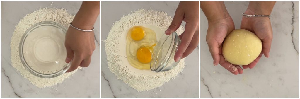 Pour the flour in a mound on the work surface. Create a hole in the center and add the eggs.