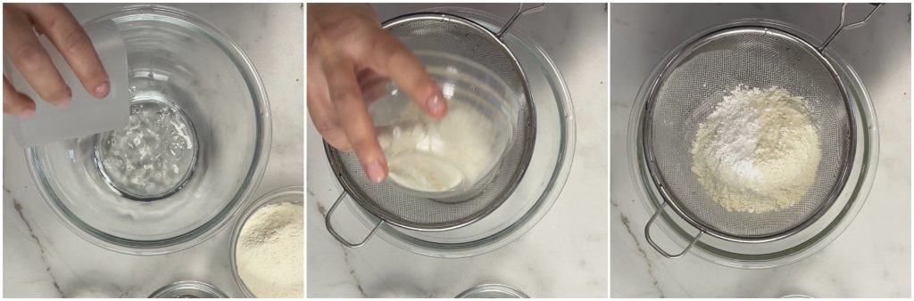 Take a sieve, place it over the bowl, and sift in the flour and baking powder.