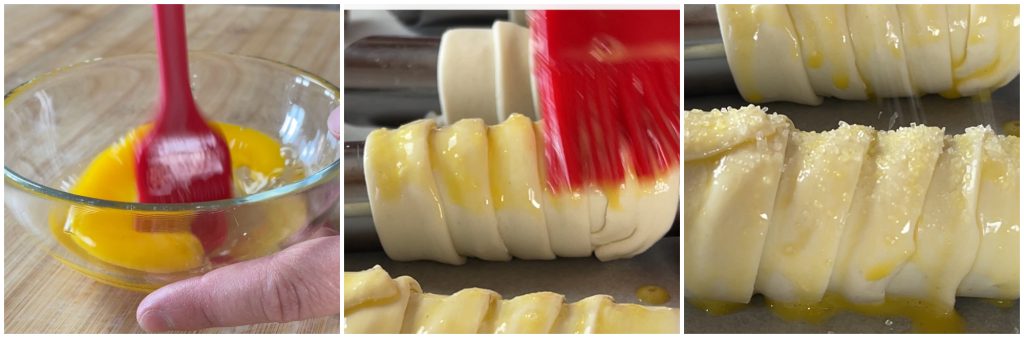 Brush each puff pastry cannoli with the egg, then sprinkle the surface with granulated sugar.