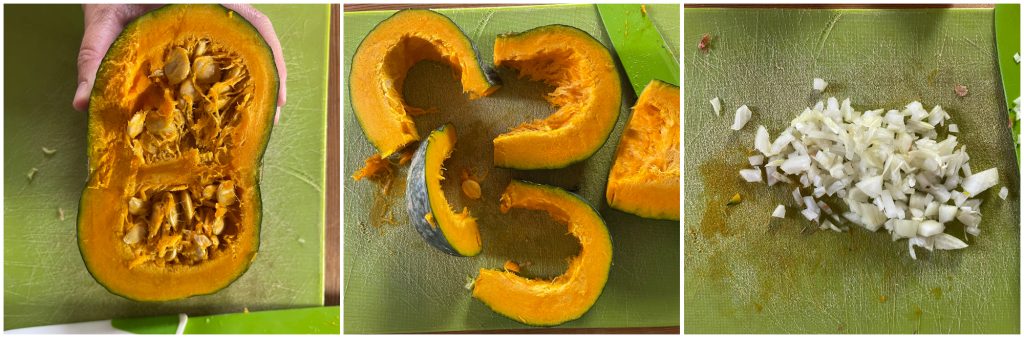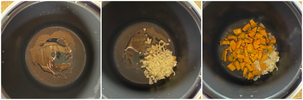 Wait for the program to finish preheating, but you will notice that the pumpkin and onion will already be sizzling.