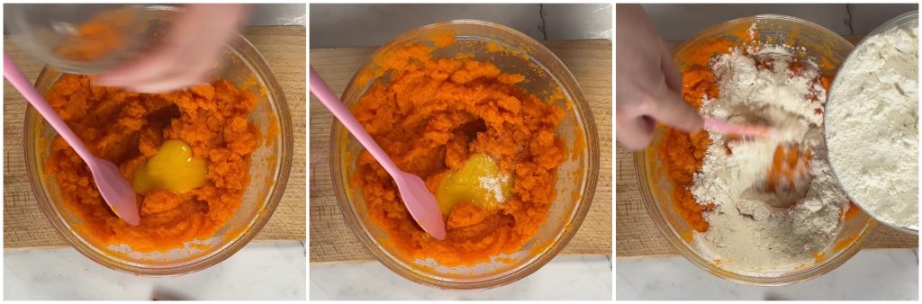• After blending the carrots until smooth and homogeneous, add the egg yolk, a pinch of salt, and an initial portion of the flour.