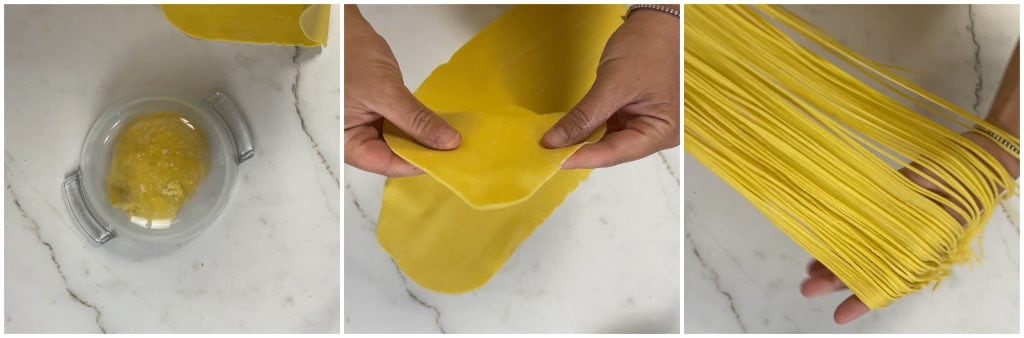 When the dough has rested, roll it out with a rolling pin or pasta machine to a thickness of about 1/16 inch. Cut your tajarin by hand or with the pasta machine cutter.