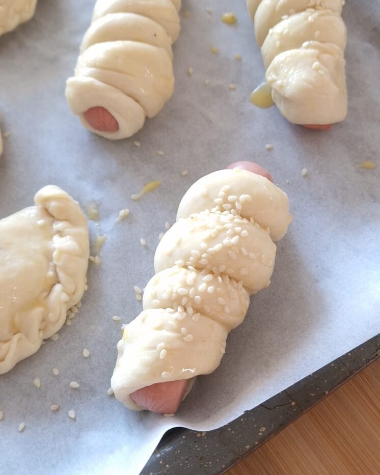 • For the rolls with hot dogs, form many small snakes to wrap around each hot dog.