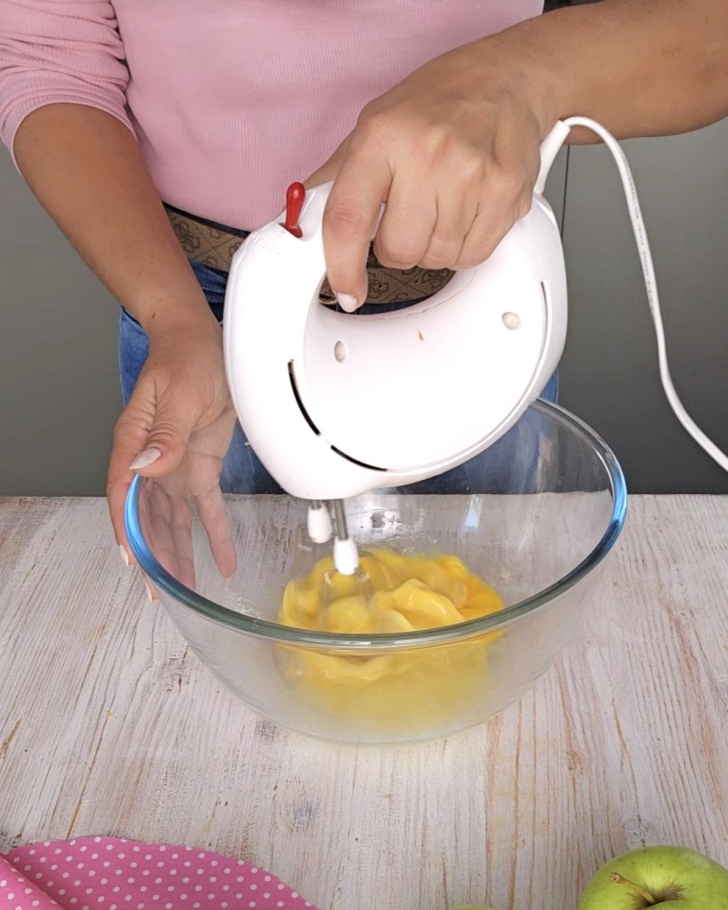 In a bowl, beat the eggs, sugar, cinnamon, and grated lemon zest with a mixer until they become frothy.