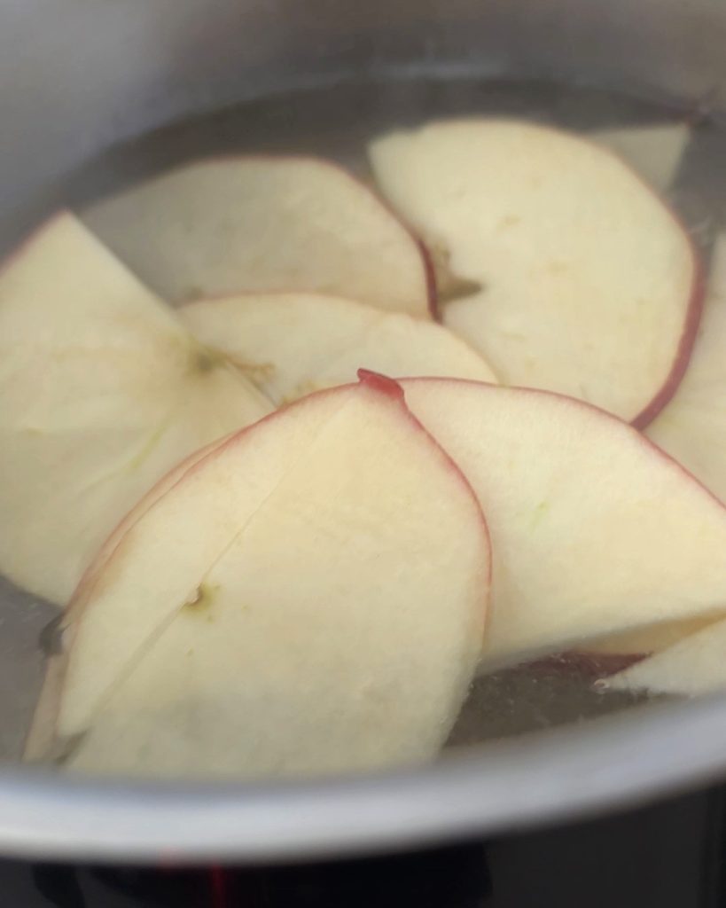 • Bring water, sugar, and lemon juice to a boil and cook the apple slices for 4 minutes. Drain them and let them cool.