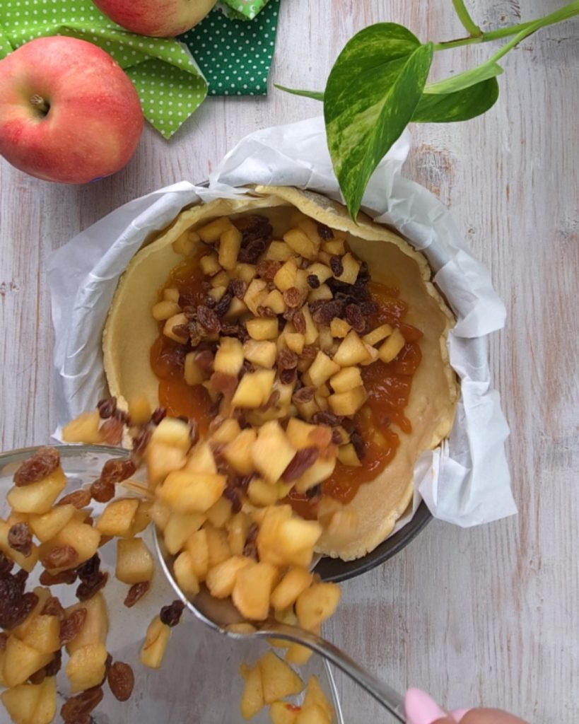 After the resting time, take the dough from the fridge and roll it out with a rolling pin to create two thin sheets about 1-2 inches thick. Fill with a layer of jam and the previously seasoned apples.