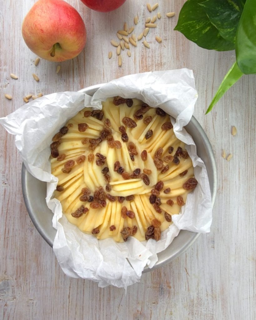 At this point, decorate the surface with the apples and sprinkle with raisins (soaked for about ten minutes in warm water), complete with pine nuts.