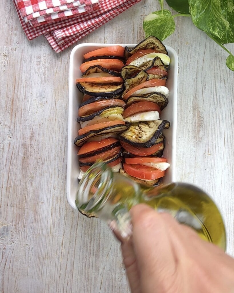 Start by arranging the eggplant slices, then the tomato slices, and finally the mozzarella slices, alternating them. Drizzle with some oil and bake at 350°F for about 15 minutes.