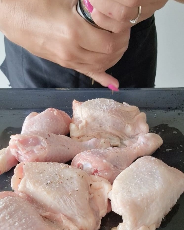 Place the chicken pieces directly on the baking sheet, then season with salt, pepper, rosemary, and extra virgin olive oil.