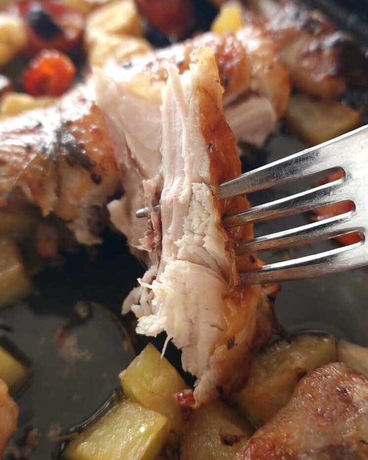 Baked chicken with potatoes and cherry tomatoes is an easy recipe with guaranteed success! Delicious prepared this way, a bit different from the classic spiced chicken or chicken with mushrooms, which are also very good. This version is baked but can be cooked in a pan or air fryer. Do you want to try it too? well, do it and then don’t forget to comment on the recipe and follow me on social media like Facebook and Instagram.