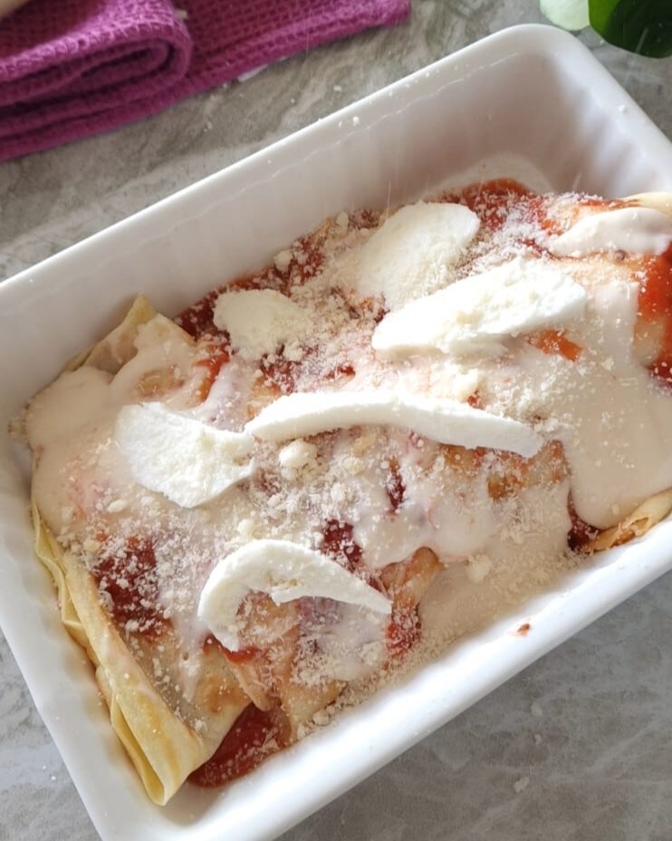 Baked Crepes with Tomato and Mozzarella are an easy main dish, savory crepes with béchamel, filled with creamy pizzaiola. The recipe is very simple and also clever; they can be prepared the day before and baked just before serving. For the filling, you can also add diced speck or some cooked ham or other cheeses, and if you don’t like béchamel, you can easily omit it. I also recommend trying the baked crespelle bundles and the crepe cannelloni with ragù! Remember to follow me on my Facebook and Instagram pages