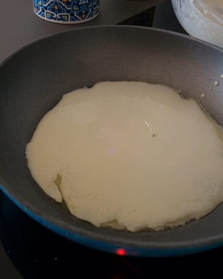 Heat a non-stick pan and grease it with a little oil, then pour a ladleful of batter, tilt, and rotate the pan to distribute the mixture evenly.