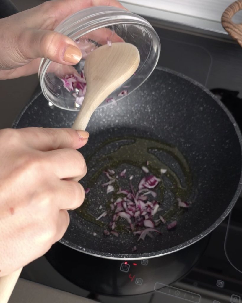 Finely chop the onion, then sauté it with two tablespoons of oil in a large pan.
