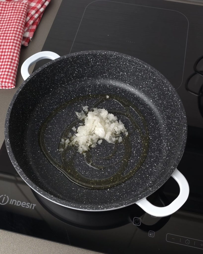 Chop the onion and sauté it in the pot with a dash of oil for a few minutes.