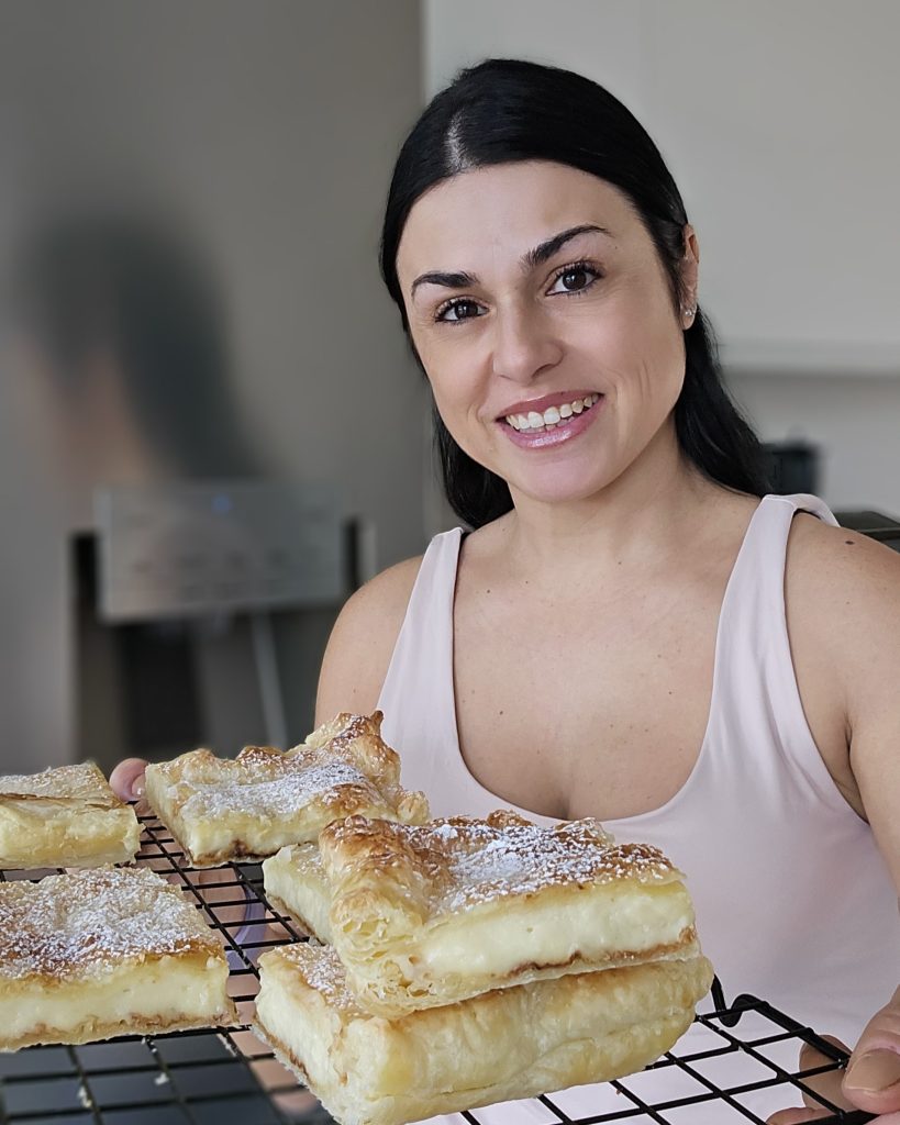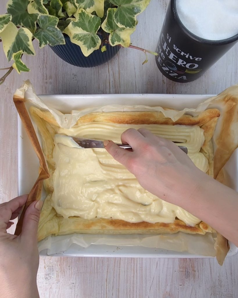 The bedside cake is a very quick recipe prepared with ready-made puff pastry! Also read 40 easy and quick recipes with puff pastry and the puff pastry tart with Nutella and also the Grandma’s cake with puff pastry. The bedside cake is a simple but very delicious Tuscan dessert thanks to the fragrant custard. The dessert mainly consists of two different textures: the crispiness of the pastry and the softness of the cream. The origins of the name might come from the soft rugs found at the foot of the bed, called bedside rugs, and the dessert lends itself to many variations, for example, you can add syruped cherries to the cream, or you can add chocolate chips or replace the classic cream with pistachio cream. In summer, you can also add fresh fruit. Oh, I almost forgot to tell you that if you want more recipes like this or are passionate about cooking like me, you should follow me on my Facebook and Instagram pages