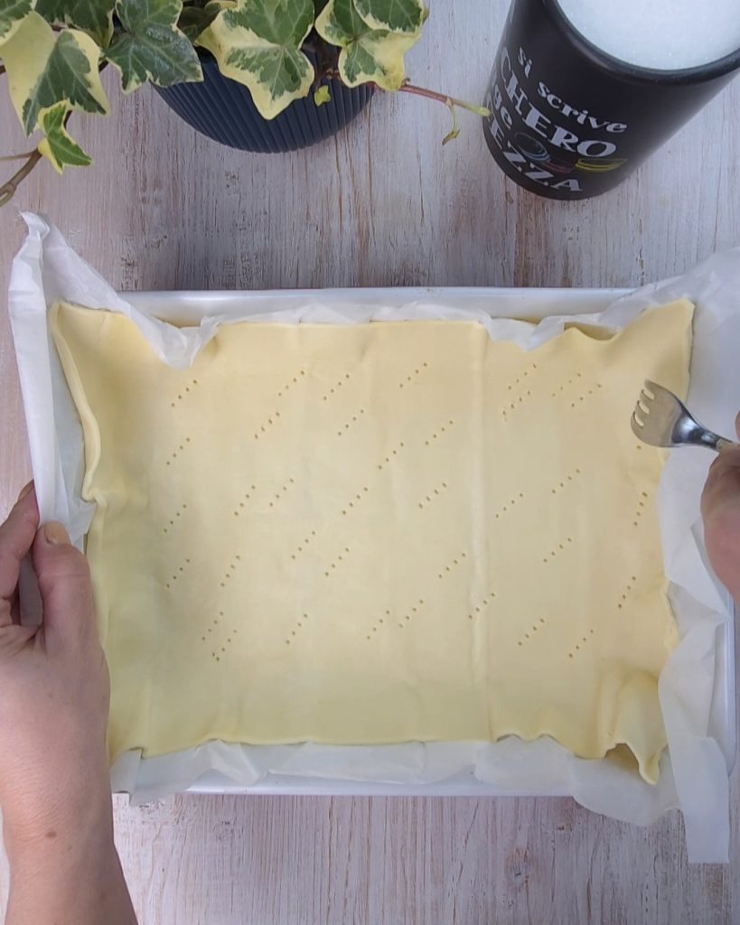 Roll out the puff pastry and prick it with the tines of the fork and then sprinkle the surface with granulated sugar. Bake at 356°F for 15-20 minutes.