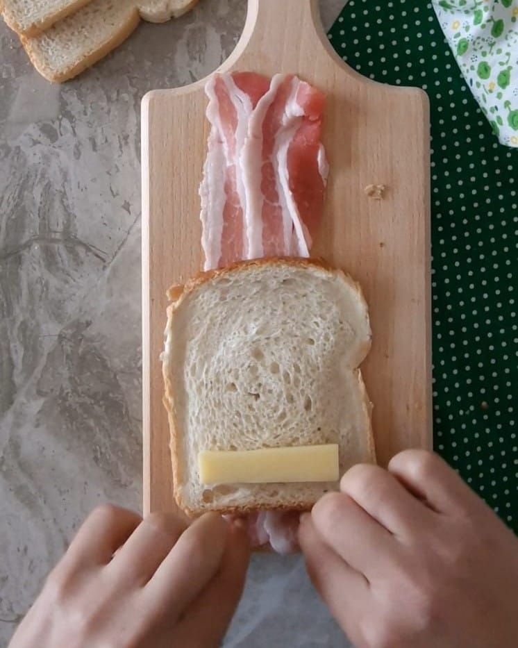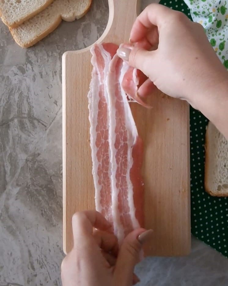 Then place 2 slices of bacon on the cutting board and lay the slice of bread on top.