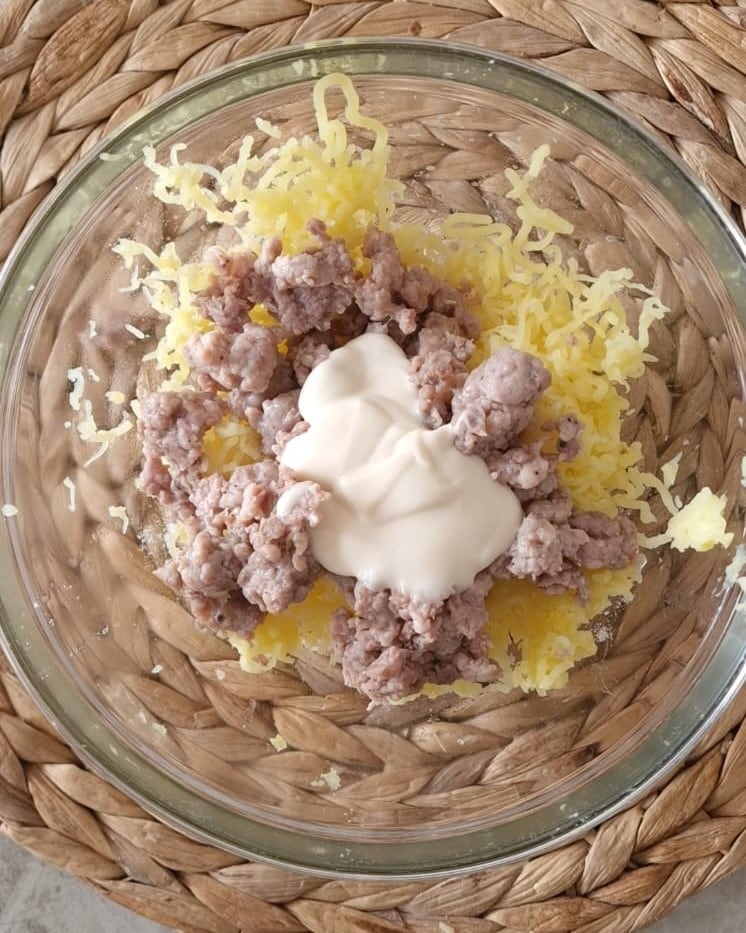 Add the sausage to the potatoes and the béchamel, then mix well.