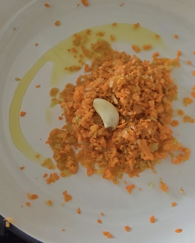 • Chop celery, carrot, and onion, then sauté in a large pot with a swirl of extra virgin olive oil and a clove of garlic.